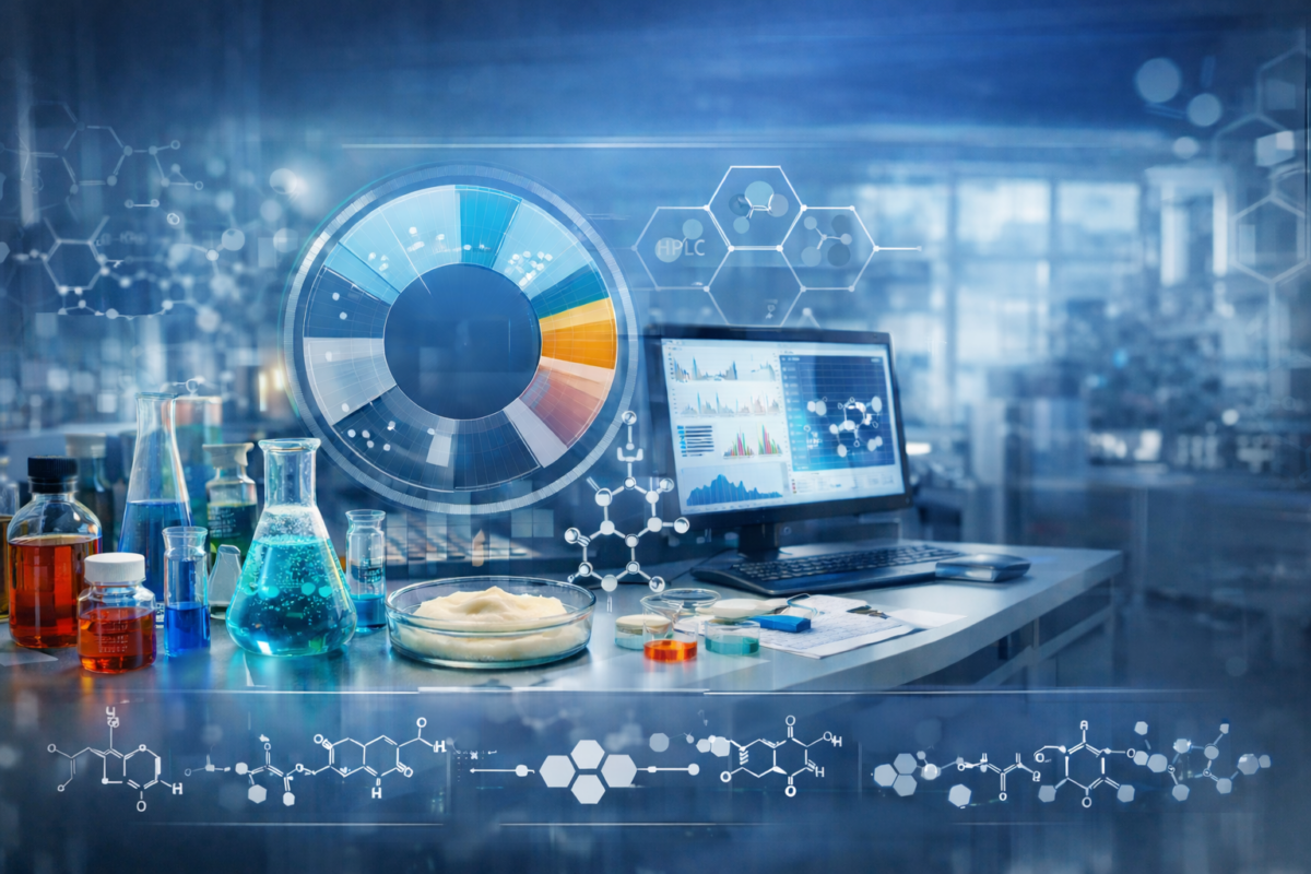 Analytical reconstruction of formulation systems, compositional mapping and structural benchmarking.