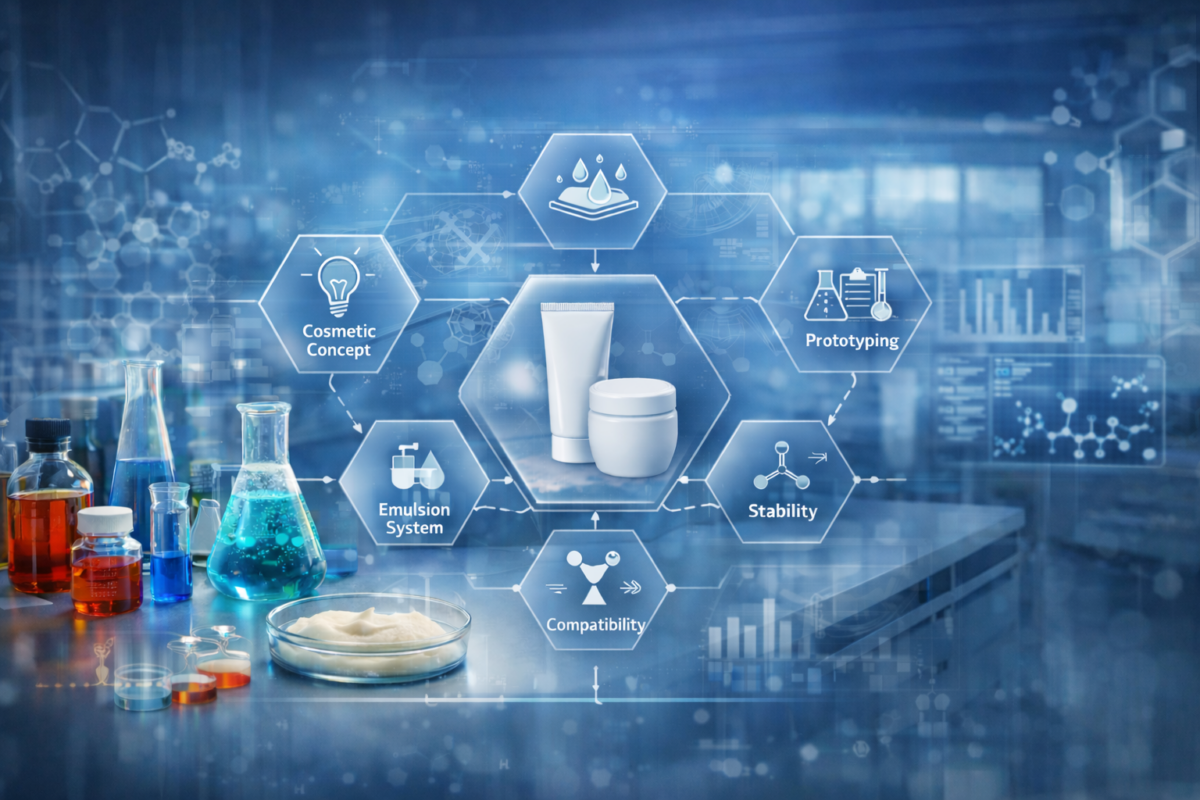 Architecture-driven cosmetic formulation from concept to validated production prototype.